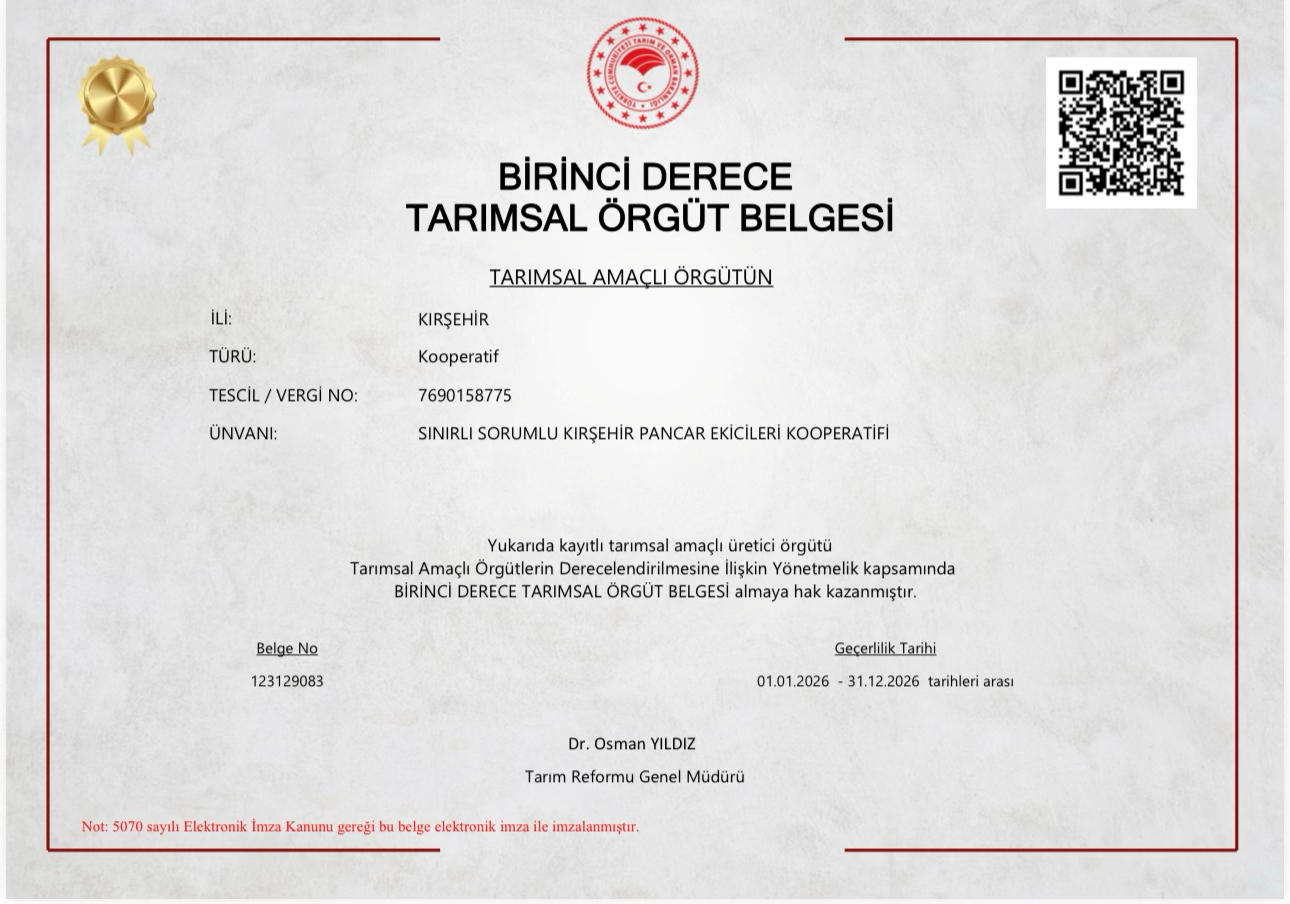 S.S. Kırşehir Pancar Ekicileri Kooperatifi olarak bu güne kadar yürüttüğümüz faaliyetlerin Tarım ve Orman Bakanlığınca değerlendirilmesi sonucu 1.Derece Tarımsal Örgüt belgesi amlaya hak kazanmıştır. Tarımsal amaçlı örgütler arasında bu belgeyi almamıza katkıda bulunan bütün Ortaklarımıza, Yönetim Kurulumuza ve Personelimize teşekkür ederiz.